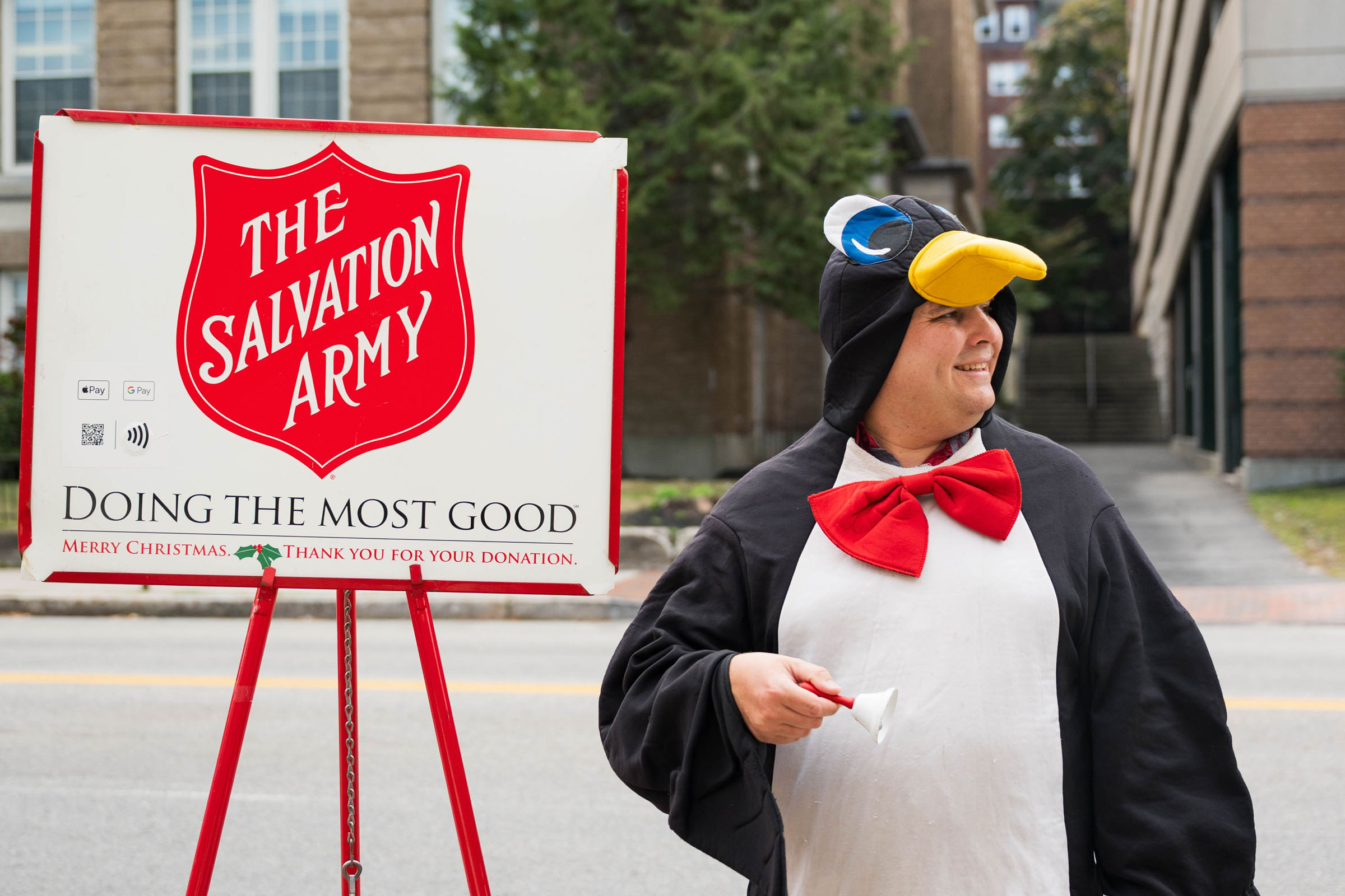 The Salvation Army helped Mark Shapp’s family when he was young, and he never forgot that generosity. Today, donning a penguin costume, he stands kettles for The Salvation Army and helps many other organizations with his time and talent. His story dovetails nicely with The Salvation Army’s “Give with Joy” campaign based on 2 Corinthians 9:7, which teaches Christian believers that “each one must give as he has decided in his heart, not reluctantly or under compulsion, for God loves a cheerful giver.”