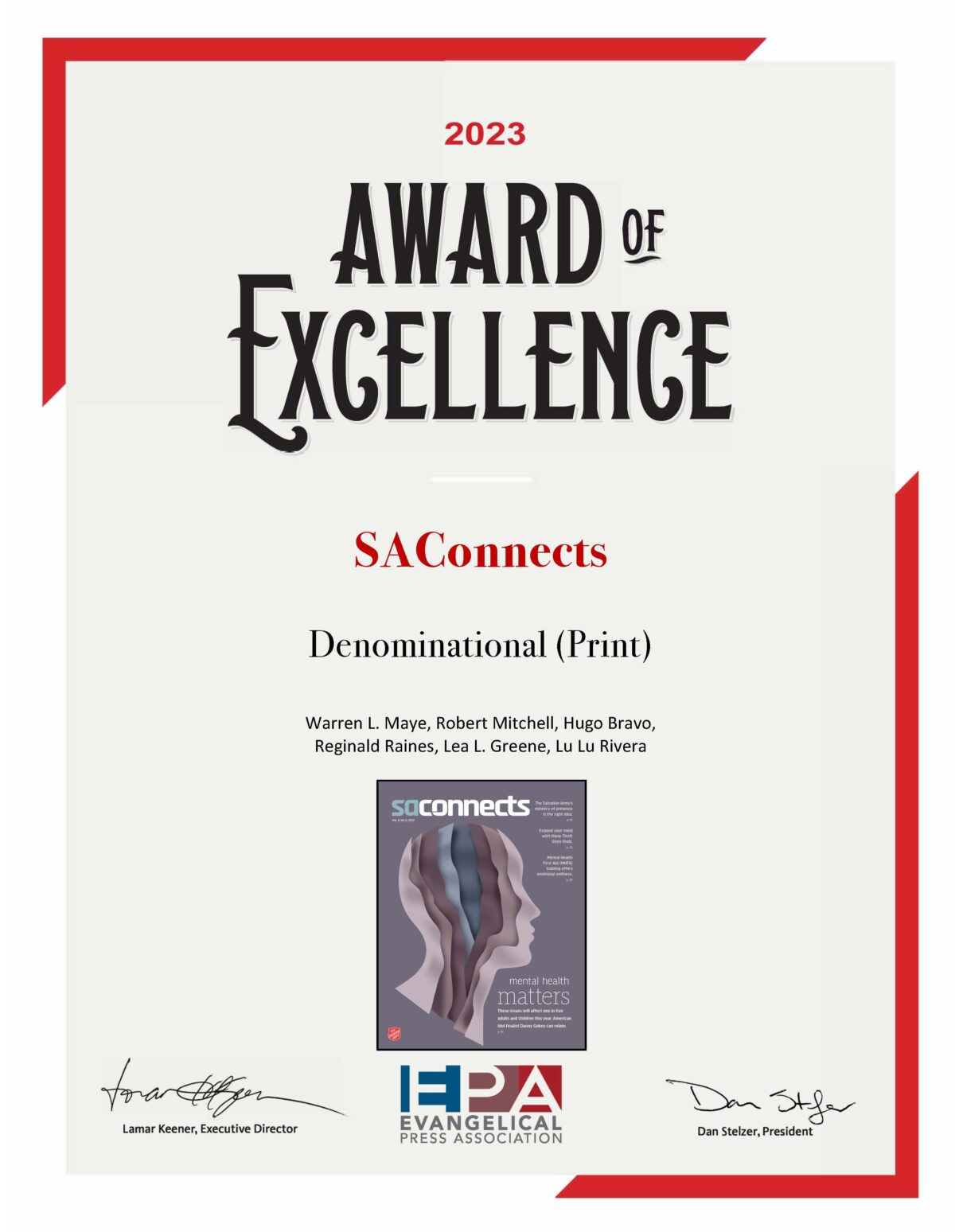 SACONNECTS magazine won the first-place “Award of Excellence” for denominational magazines in the United States at the Evangelical Press Association (EPA) annual conference in Lancaster, Pa., April 9-11.