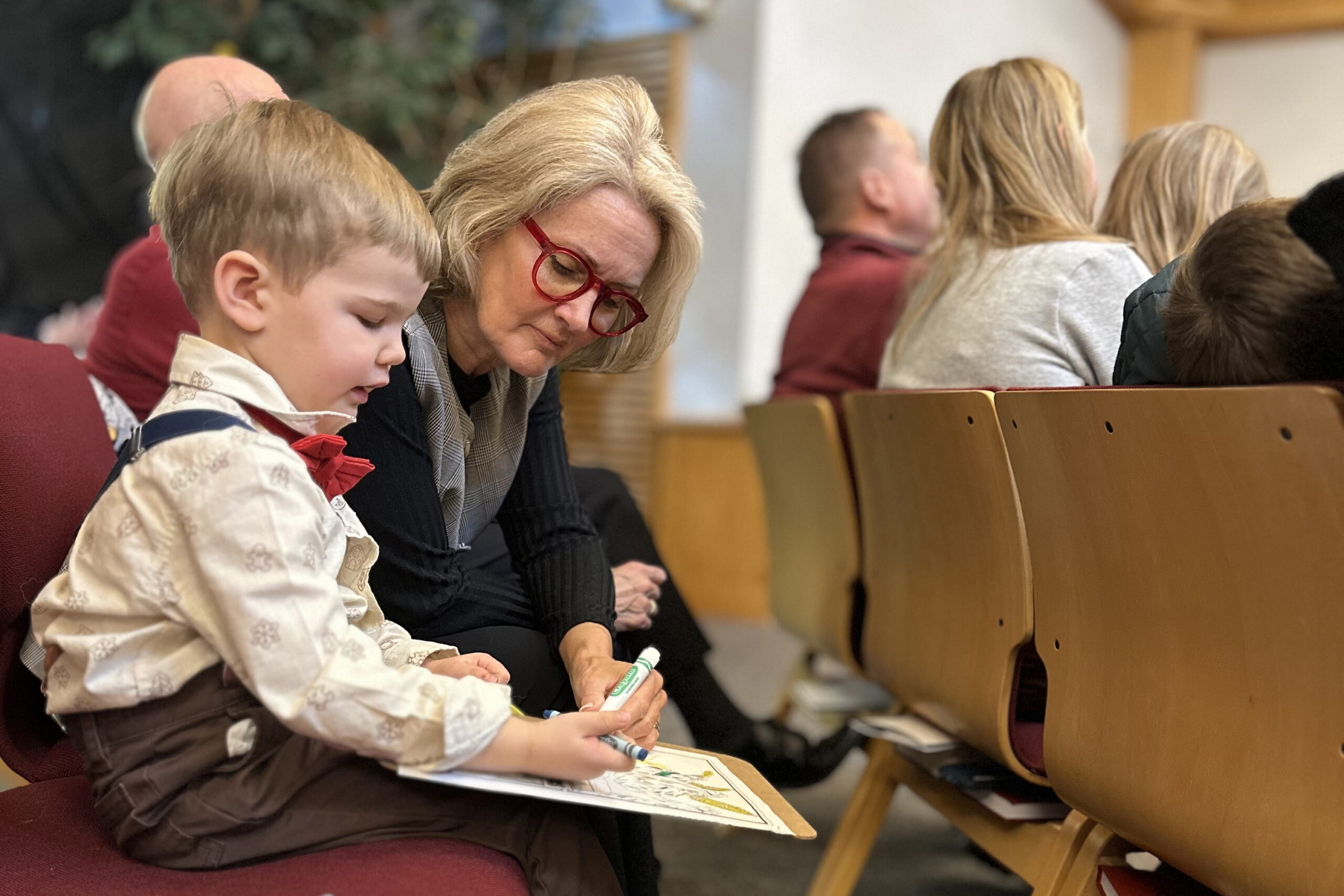 Colonel Janet Munn helps Morgan Irish-George’s 3-year-old son, Charlie, color a picture at the corps in Old Orchard Beach, Maine. (Photo/Courtesy of Morgan Irish-George)
