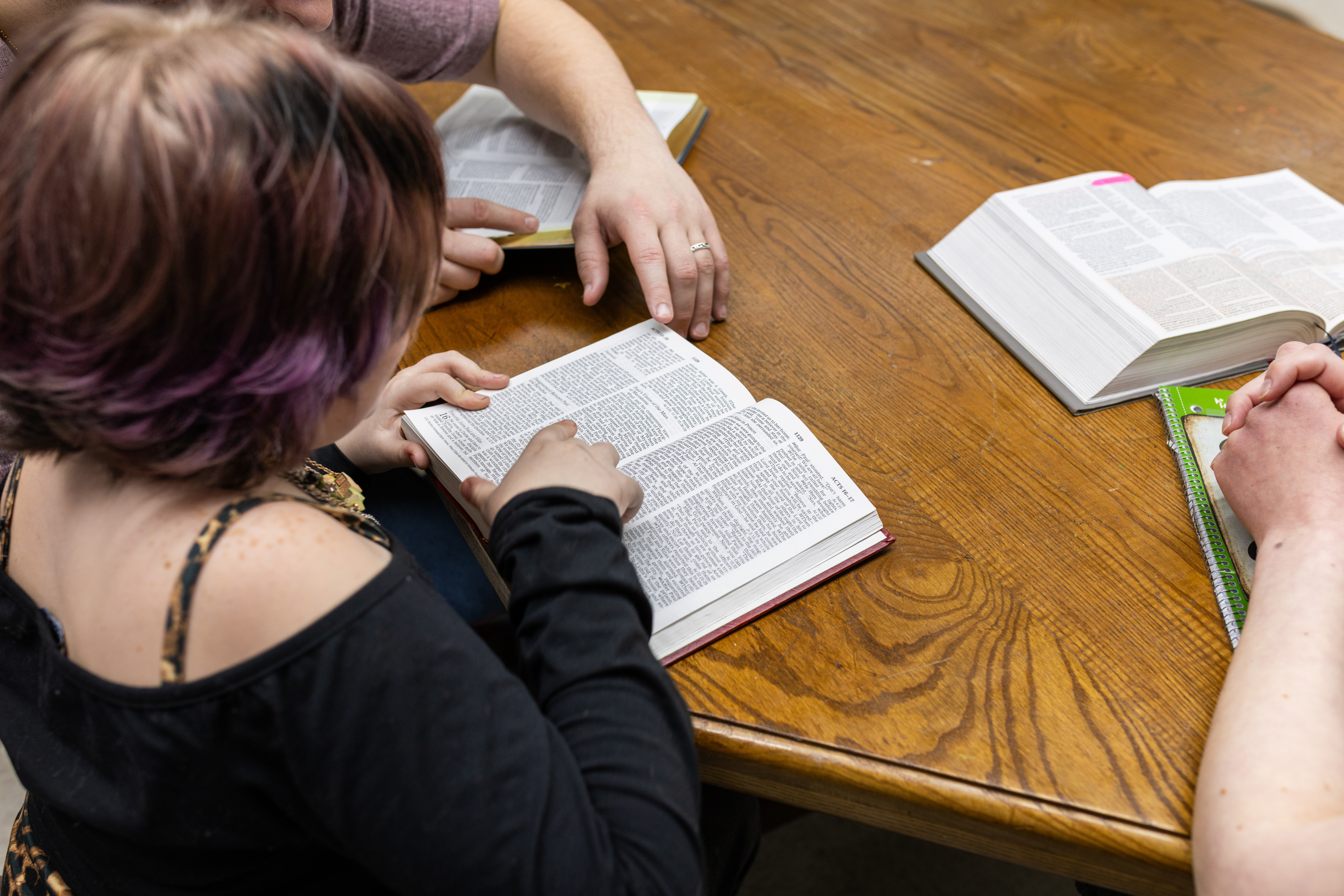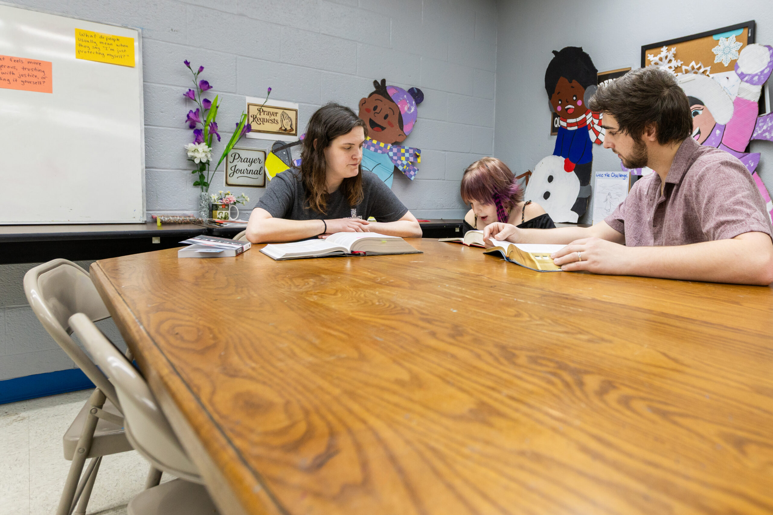 Annabelle Pedersen learns the importance of reading and studying Scripture during her one-on-one discipleship sessions (or one-on-two, in her case) with Shelby Van Cleef and David Simon in Pottsville, Pennsylvania. Annabelle gets to see how her mentors respond to life’s challenges and live their lives according to the Bible. (Photo/Jeff Bruce)