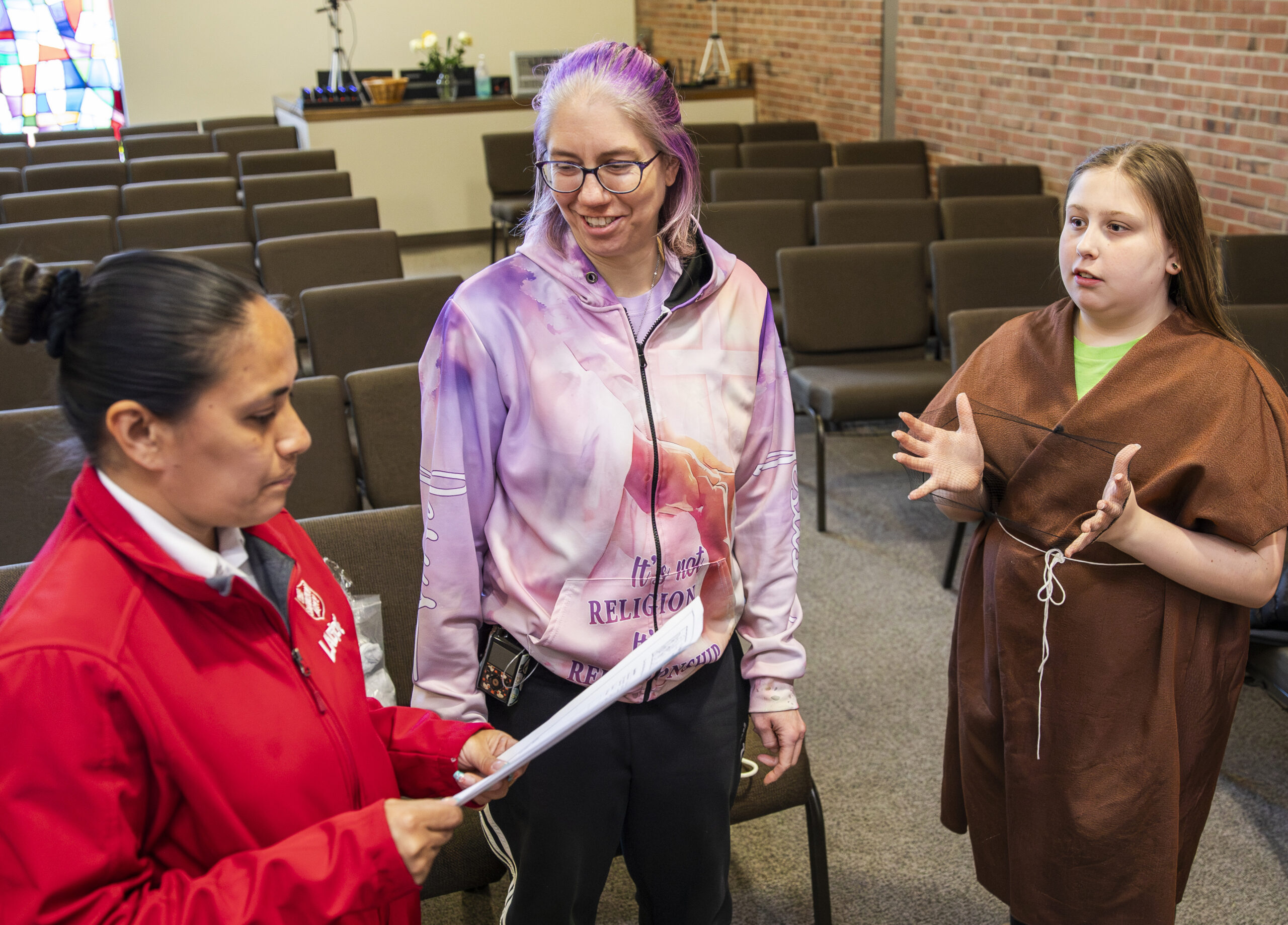 Captain Irseris Ortiz (left) gives direction to Arwen Barba, 12, playing Judas in a reenactment of Jesus in the Garden of Gethsemane. Arwen’s mother, Elizabeth, is helping with the sound production as a narrator.