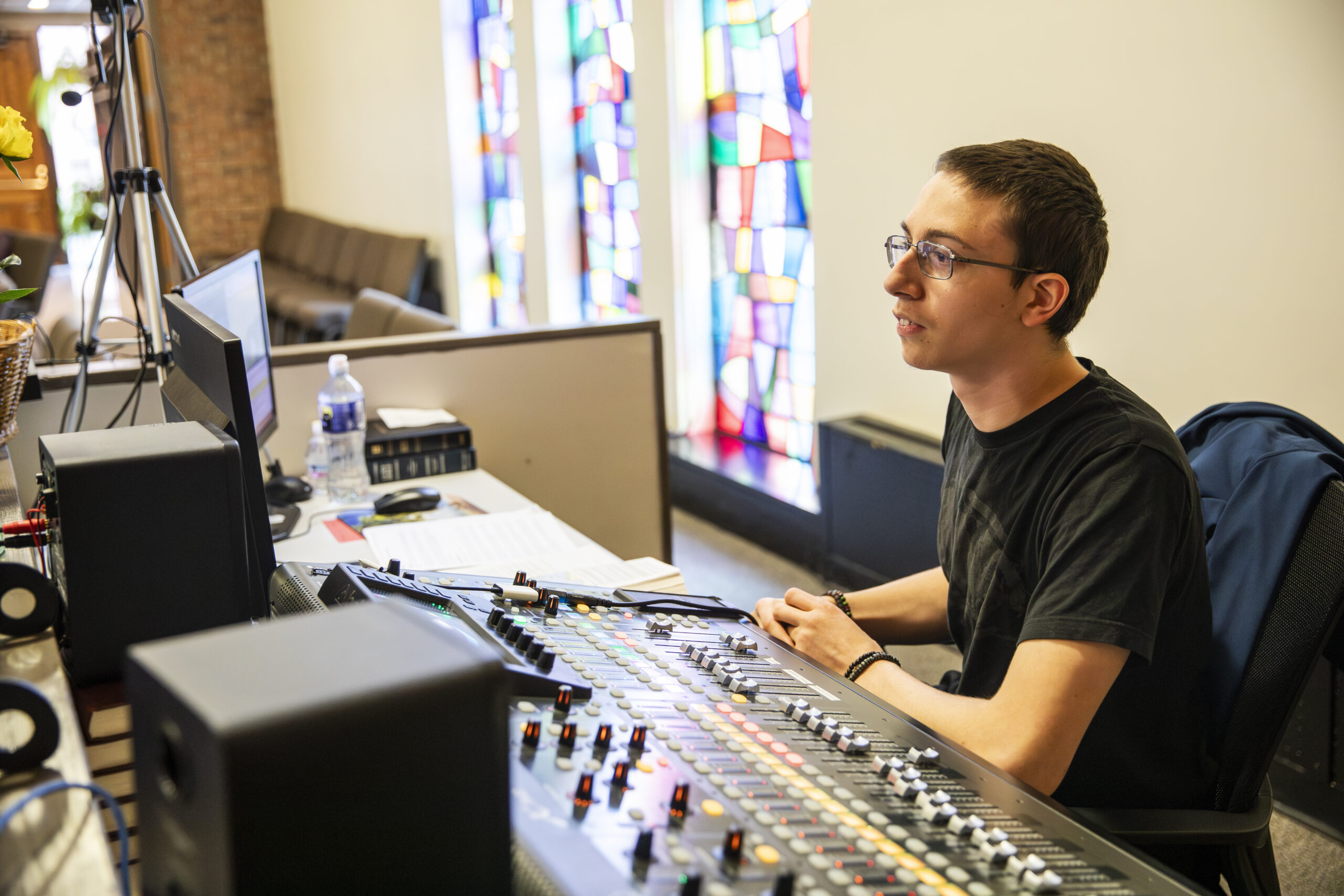 Jack Barba runs the soundboard for the Holy Week activities at the corps.