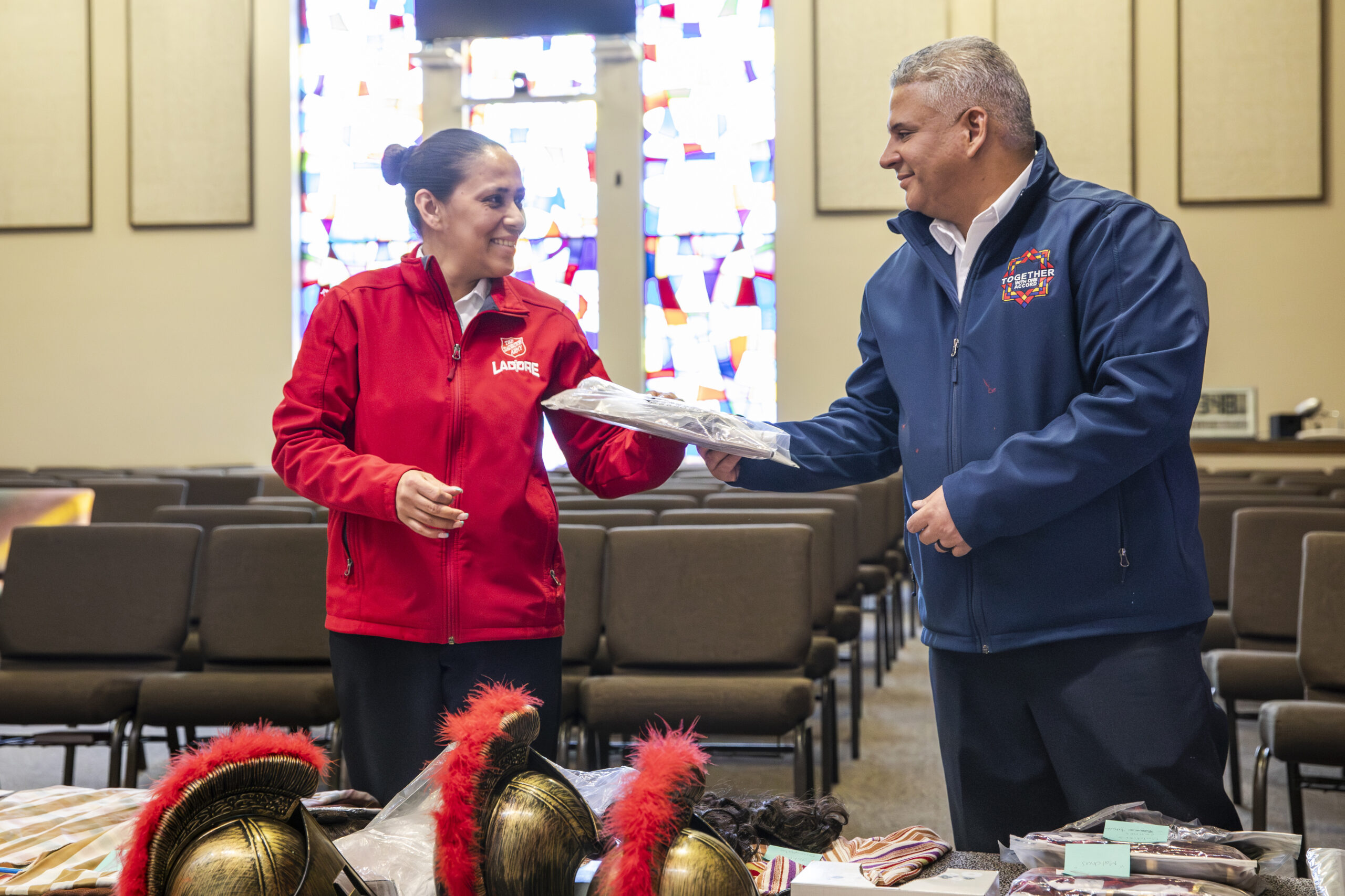 Captains Irseris and Ismael Ortiz lead the corps in Wilkes-Barre, Pennsylvania, and want to make sure everyone knows the importance of the death, burial, and resurrection of Jesus Christ. During rehearsal for Holy Week activities, two Roman soldiers, played by Celines Campos and Yahaira Tavares, prepare to arrest Jesus, played by Josue Campos.